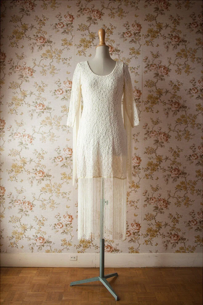 - Bohemian lace dress with fringes on sleeves and bottom of dress